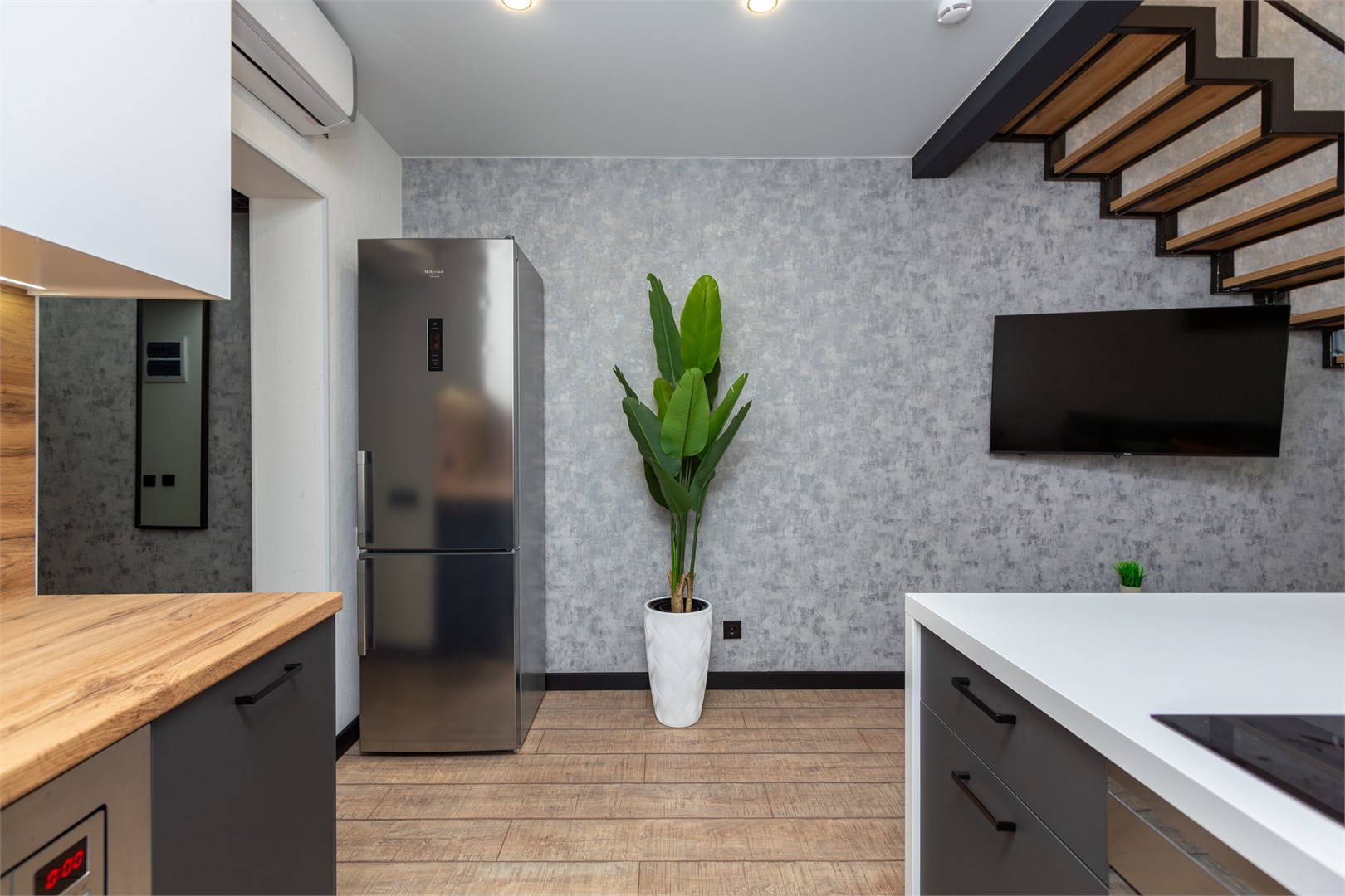 - Оборудование: духовой шкаф, кондиционер, микроволновая печь, набор посуды, плита электрическая, посудомоечная машина, стиральная машина, телевизор, утюг, холодильник, электрочайник